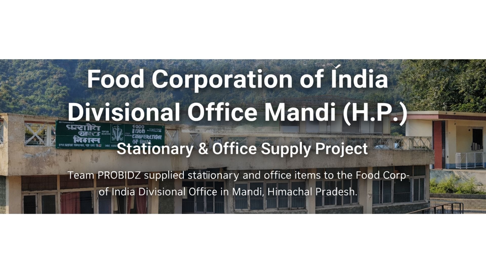 PROBIDZ successfully completed the supply of stationary and office items for the Food Corporation of India (FCI), Divisional Office Mandi (H.P.). The project was executed with a focus on timely delivery, quality and compliance with institutional procurement standards.